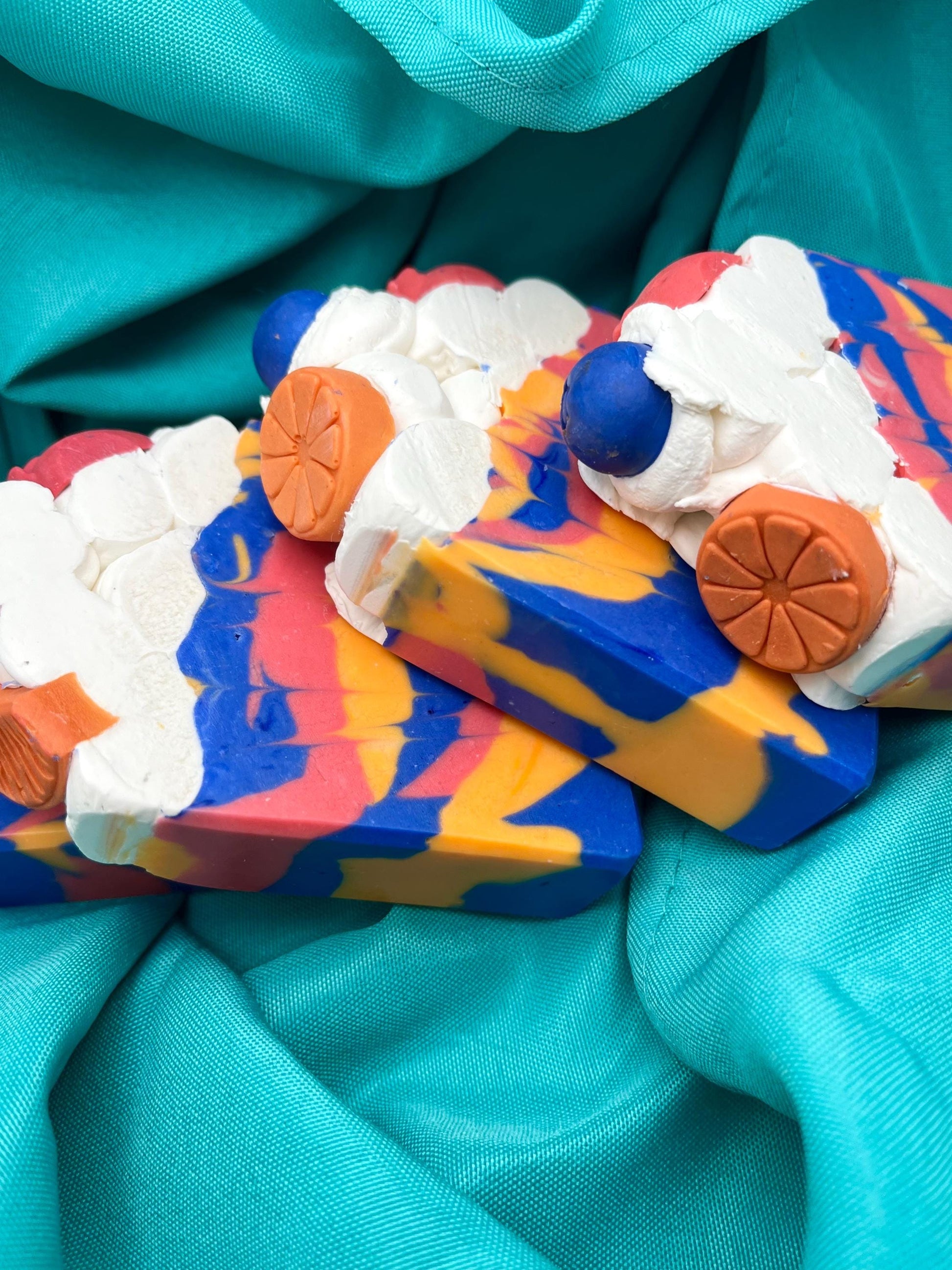 This fancy fruit salad soap is bound to brighten up your bathroom! It makes the perfect luxurious addition to a guest bathroom as well! This soap is handmade by me with simple, nourishing ingredients.